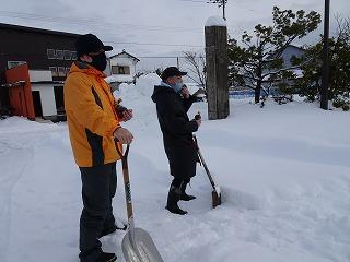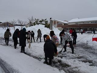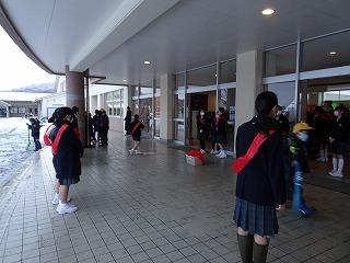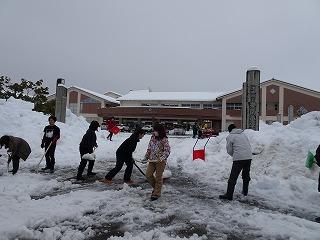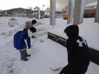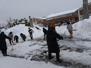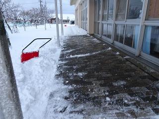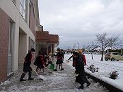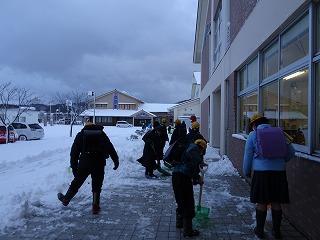 ↓玄関では5・6年生と先生たちで除雪を行いました。