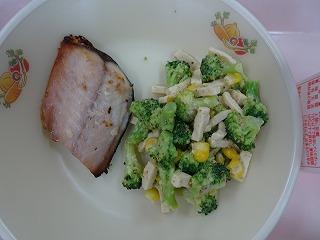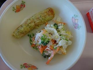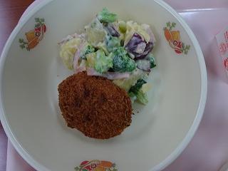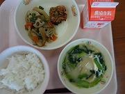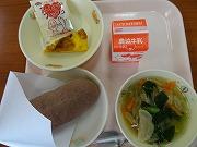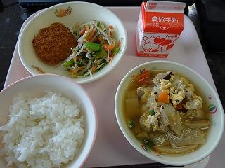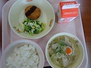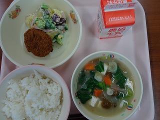 ↑今日の給食は、かほっくりのサラダと豆腐となめこの味噌汁、ごぼうのサクサクコロッケでした。彩りもよく、野菜をおいしくいただくことができ、体もほかほかに温まりました。