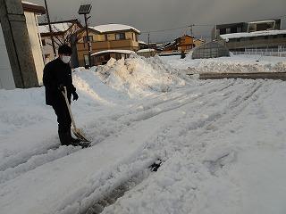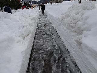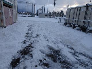 ↓給食車の出入りがしやすいように、また、給食の材料の搬入がしやすいように、校務士さんがすでに余念のない除雪をしてありました。皆さんのお世話のおかげで給食をいただくことができます。感謝していただきましょう。