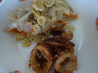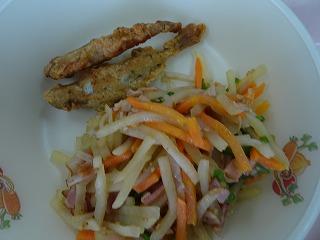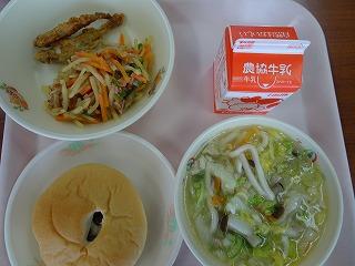 ↓今日の給食です。豆パン、わかさぎフリッター、じゃがきんぴら、鶏塩うどんでした。じゃがいものきんぴらはシャキシャキした食感で、とてもおいしかったです。