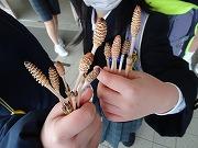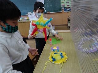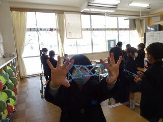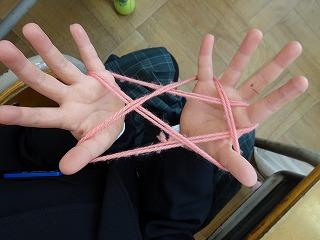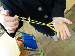 ↑1年 生活科の時間に先生からあやとりのひもをもらいました。早速、作ったものを見せてくれました。