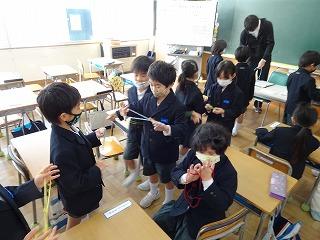 ↑保健の先生から、6年生へプレゼントがあるそうです。一人一人が6年間に伸びた身長の記録です。青いリボンは、実際の6年間の身長の伸びた長さです。一人一人計算して、作ってくださいました。小学校の宝物の一つにしてくださいね。