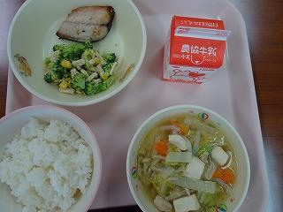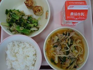 ↑今日の給食は、豚キムチラーメン!ちょっぴりのピリ辛が体をほかほか温めてくれます。たっぷりのブロッコリーは免疫力アップでうれしいメニューです。そして、何とも言えないくらいおいしい、コーンシュウマイ!今日も大満足のおいしい給食です。