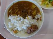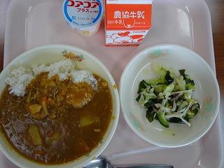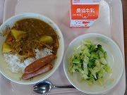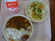 ↓今日の給食は、大人気のカレーです。あらびきウインナーとグリーンサラダに麦ごはんのカレーです。給食のカレーは、とってもおいしいのです。