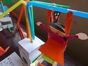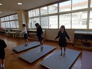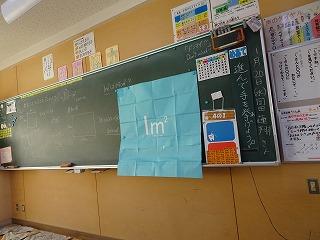 ↑4年算数 1㎡を体感しました。1㎡をつなげて、エレベータの広さは、これくらいかな?乗ってみたりしました。