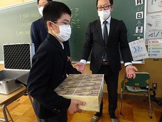 6年 租税教室↓ 金沢法人会のゲストの先生方と租税について考えました。1億円を持ってみました!(レプリカです。本物そっくりですが)