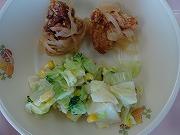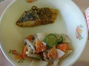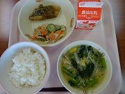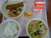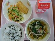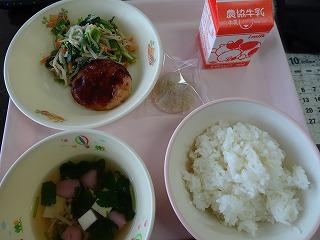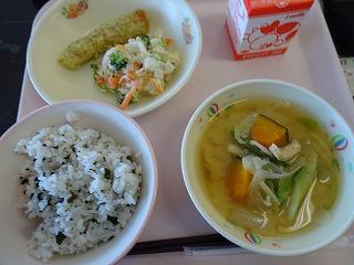 ↑今日の給食は、わかめご飯、ちくわの磯部揚げ、白菜の柚みそサラダ、かぼちゃの味噌汁でした。いろどりがとても美しいです。今日もおいしい給食でした。