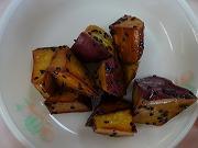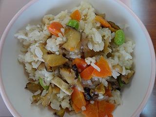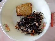 それから、打ち豆入りのあいまぜ、スルメイカのから揚げ、豆腐とわかめ、ふかし入りの味噌汁です。「打ち豆」は大豆の保存食の一つで、大豆をつぶして平たくし、乾燥させたものです。雪深い北陸で家庭料理として使われてきました。香ばしくて、栄養たっぷりです。能登でとれたスルメイカのから揚げは、カミカミメニュー、噛めば噛むほど旨味が出てきます。味噌汁のふかしは、彩りよく、春の気配を感じさせてくれます。今日の給食は「能登献立」でした。明日は「金沢献立」です。楽しみですね。