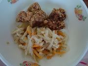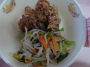 ↓ 今日の給食です。もやしのナムル、ヤンニョムチキン、肉団子スープ、本格的な韓国料理です。