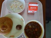↑今日の給食は、チリコンカン、クラムチャウダー、ハムチーズピカタ、ピタパンでした。チリコンカンはアメリカで人気の料理だそうです。クラムチャウダーもアメリカが発祥の地だそうで、今日はアメリカ気分を満喫できた給食でした。