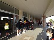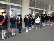 たくさんの6年生が玄関に立って、下級生とあいさつを交わしています。