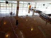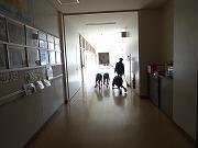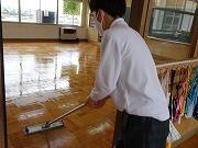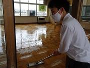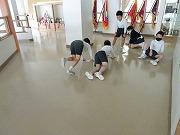 ↓3年生 長い長い廊下を、何往復も水拭きをしています。今日は廊下ワックスがけのため、全校で廊下をきれいに掃除しました。