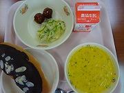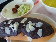 ↓今日の給食です。今日は卒業お祝い献立で、調理師さんお手製のエクレアパンです。お祝いの気持ちをたっぷりのチョコレートに託して、アーモンドスライスをまぶしてくださいました。愛情たっぷりの甘くてふわふわのエクレアパンはとてもおいしかったです。かぼちゃのポタージュスープや甘酢肉団子は、定番の人気メニューです。ありがとうございました。