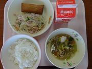↑今日の給食は、春巻き、バンサンスウ、八宝菜です。春巻きの皮はパリパリ、中はしっとり、おいしかったです。春雨もさっぱり、春の感じです。家でも作ってみたいです。