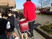 ↓4月から、ピカピカの新1年生、今日はランドセルを背負っての登校練習です。4月から、安全に歩いてこれるように、お家の人と練習をしています。入学式が、待ち遠しいですね。