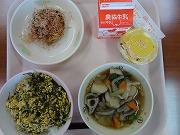 ↓今日の給食です。そぼろご飯には、ツナと広島菜も入って、栄養たっぷり、おいしさいっぱいです。広島風お好み焼き、八寸、レモンゼリーでした。今日は広島料理です。広島県の郷土料理の八寸とは、「煮物」だそうです。広島県のことをもっと調べてみてくださいね。