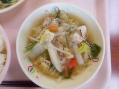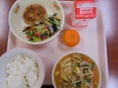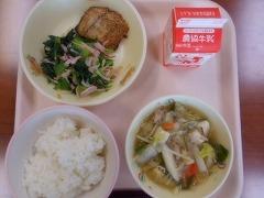 ↑今日の給食です。今日は、チヂミ、小松菜とのりのナムル、豚キムチラーメン、みかんです。ラーメンには、白菜、たねぎ、もやし、しめじ、にら、そして、豚肉とキムチ、具がたっぷり入って、キムチで体が温まるあつあつメニューでした。唐辛子は体が温まりますので、これからの季節は、味付けにキムチを使いたいですね。