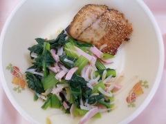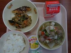 ↑今日の給食は、ごはん、さばのみりん焼き、小松菜とハムの和え物、寄せ鍋でした。さばなどの青身の魚は体に良いですのでたくさんいただきたいです。みりん焼きにすると、食欲が増します。寄せ鍋には豚肉やふかし、焼き豆腐に白菜やにんじんえのきだけ、ねぎがたっぷりであつあつでした。なべおいしい季節ですね。