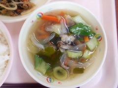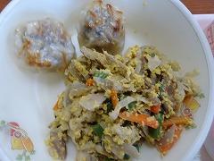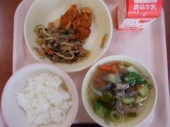 ↑今日の給食です。ごはん、ヤンニョムチキン、米粉めんのチャプチェ、あさりとわかめのスープでした。ヤンニョムチキンはカラッと揚げたフライドチキンに甘辛い味付けがされており、子供たちには大人気メニューでした。チャプチェには、米粉めんのほか、牛肉や大豆ミート、それから、にんにく、玉ねぎ、にんじん、きくらげ、小松菜など食材が豊富に入っていて、とてもおいしくいただきました。今日は韓国料理でした。
