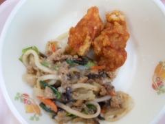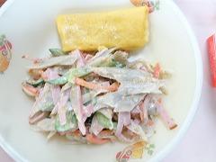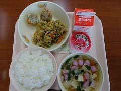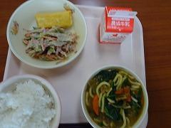 ↓今日の給食です。今日は、カレーうどん、ツナ入り卵焼き、ごぼうサラダでした。ごぼうで食物繊維をたっぷりといただくことができました。カレーうどんは、温まります。寒くなってきましたので、体が温まるメニューで、子供たちは大喜びでした!