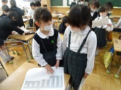↑6年算数 年代別人口の推移やバスの運行表のグラフを見て、資料を読む学習をしました。