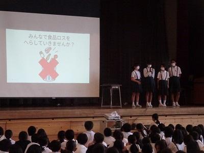 給食委員会さんからはごみの袋の数が大幅に削減されているというお話がありました。牛乳パックの片づけ方を変更したことがよかったようです。あわせて食品ロスを減らすために残食を減らす呼びかけがありました。学校の給食は栄養バランス・味共に抜群です。作ってくださる方に感謝しながらしっかり食べてほしいです。