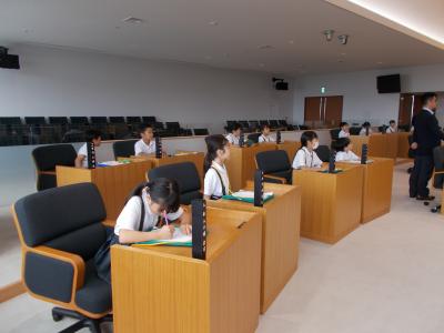 議場で議員の方の座席に座ったり,実際の議会のように質問したりもしました。