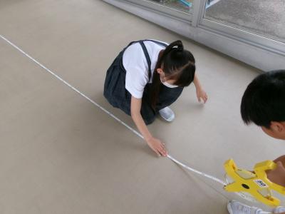 普通のものさしよりも長いもの・距離を測るので,0の位置がずれないようにしたり,まっすぐ測ったりするのに,グループの協力が不可欠です。