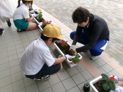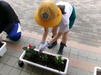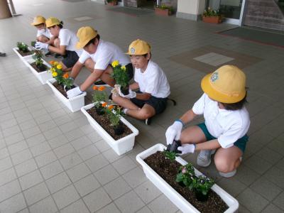 町の担当の方・人権擁護委員の方に来ていただき,校舎前のプランターに花を植える活動を行いました。