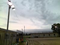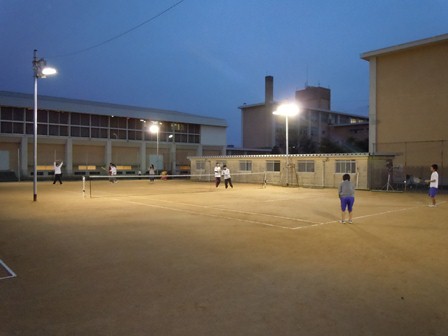 加賀高校のテニスコートには、このように照明があります。照明に照らされる中、ボールを打つ部員も喜んでいました。これなら、空が暗い時でも安心ですね。今後も時間を大切にして練習を頑張っていきましょう!