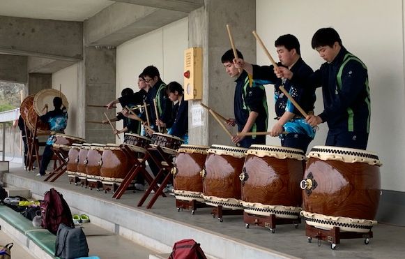 加賀温泉郷マラソンで和太鼓の演奏を披露しました。新型コロナウィルスの影響で、今まで屋外の演奏ができなかったのですが、今日は県内外から集まった多くの参加者の方々に観覧席から和太鼓演奏による応援をすることができました。部員みんなで「次、これを演奏するから準備して!」と声を掛け合って演奏する一致団結した姿もみていただきました。選手の皆さんから「かっこいい!」と言ってもらえたり、ガッツポーズで応えてもらえたり、すごく楽しんでもらえたようです。これからも加賀高校和太鼓部の活躍に期待してください。(2年部員)
