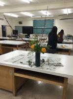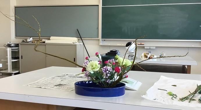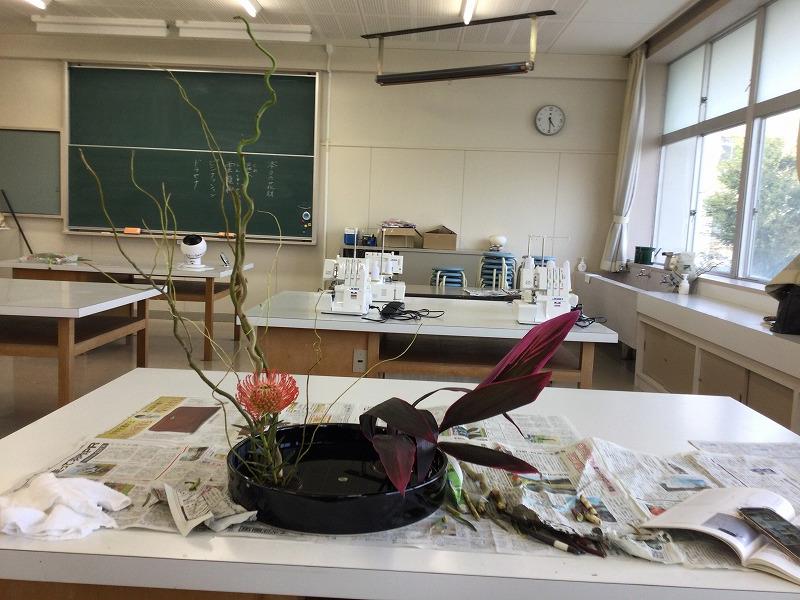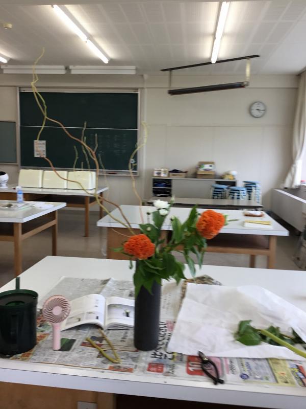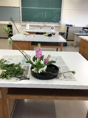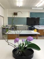 月2回の水曜日、被服実習室で活動しています。3年生1人、2年生1人、1年生3人と人数は少ないですが、外部講師の先生に草月流の生け方を習っています。当面の目標は、文化祭で「自由生け」の作品を展示することです。総文後の今は、一人一人が草月流のテキストやノートを活用し、基礎からみっちりと学んでいます。