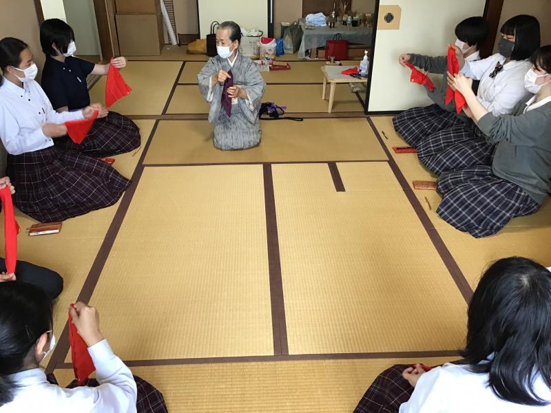 茶華道部(茶道部門)は、毎週火曜日に和室で活動しています。現在部員は、3年生3人、2年生5人、1年生4人の計12人です。外部講師の山口先生から、様々な所作を教えていただいています。コロナ感染防止のため、お点前をすることはできず、自分でお茶をたて自分で飲むという形ですが、和気あいあいと楽しく活動しています。
