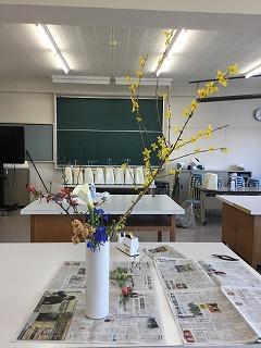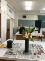 3月13日(水)は今年度最後の練習で、土佐ミズキ、黄スカシ百合、スプレーカーネーション、スターチス、ロべ(アレカヤシ)でした。しなやかなミズキの枝を生かして、黄色の百合が開いたときの形を想像して生けました。今回も春らしい作品になりました。