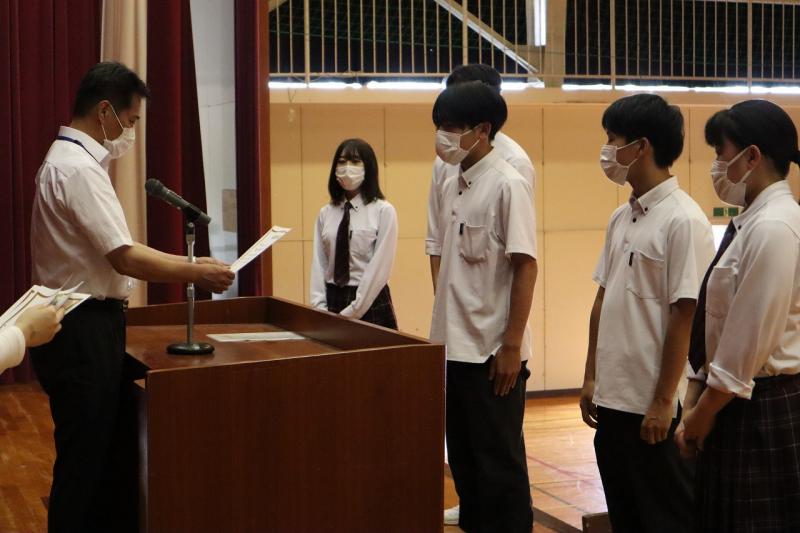表彰式では、球技大会優勝チーム、商業科・国語科の検定合格者、1学期に多く本を借りた生徒を表彰しました。