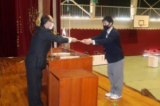 表彰伝達式では、全国表彰である御下賜金記念優秀卒業生および総合学科優秀者の表彰をはじめ、成績優秀者、出席状況の良かった生徒への表彰が行われました。