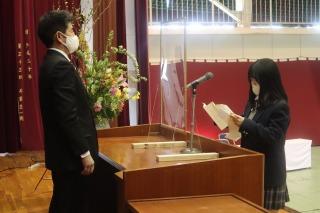 卒業生代表で乾君が答辞を述べました。個性の強い仲間たちだけど、目標に向かって一丸になれる素晴らしいクラスということ、また、先生方、保護者への感謝が詰まった良い答辞でした。