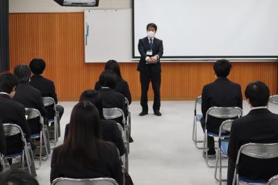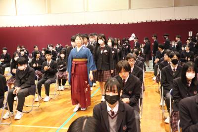 2/9(金)3年生の終業式を行いました。校長先生から「社会基礎力とは」のテーマで①前に踏み出す力②考え抜く力③チームで働く力についての話がありました。進路指導・生徒指導・学年主任・担任の先生方から激励の言葉が送られた後、3/1(金)に行われる卒業式の所作の練習を行いました。
