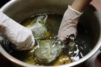 12/9(月)「服飾手芸」の校外学習として、片山津の花館で「晶子染め」を体験しました。生徒は説明を聞きながら、丁寧に作業を行っていました。それぞれ、異なる柄模様・染め上がりとなり、素敵な作品が完成しました。