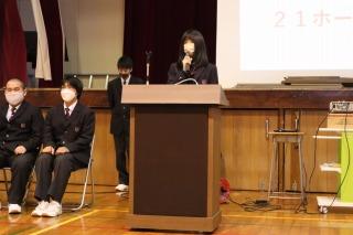 また本校創立50周年のスローガンを生徒・保護者・同窓生から募集し、「夢よ輝け ~託して・繋げて・受け継いで~」に決定しました。スローガンを考えた32H平岡 沙彗さんと12H佐藤 遥菜さんが表彰されました。