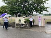 通学時間帯はあいにくの雨となりましたが、自転車で通学する生徒は、カッパを着用し一時停止や左側通行を守って安全に登校していました。
