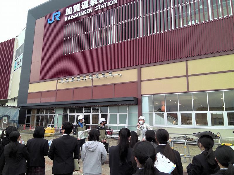 工事現場や加賀温泉駅を見学し、加賀建設業協会の方々からお話を聞きました。