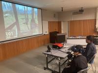 11/20(水)5~6限目、1年生を対象にキャリア教育の一環として「林業出前講座」を行いました。講義や動画を通して、森林を守り育てる林業の重要性について学びました。また、高性能林業機械シミュレーターやドローンシミュレーターを体験したり、中庭でチェーンソーの実演を見学しました。