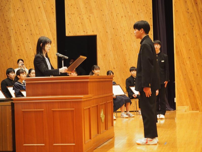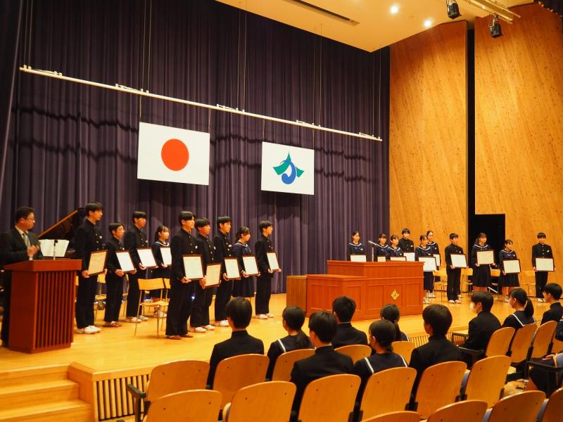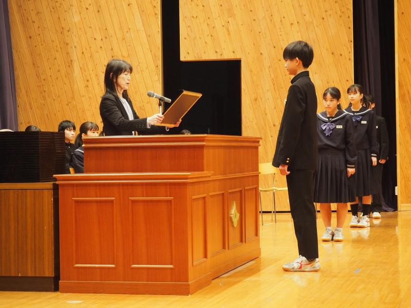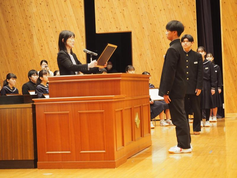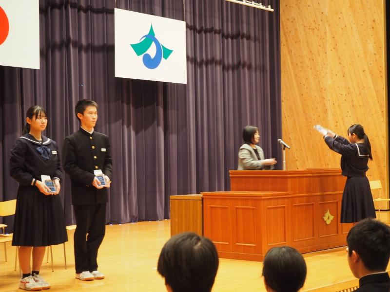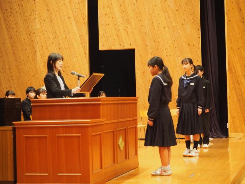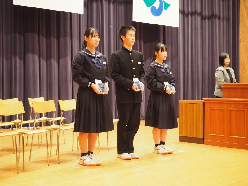 予行練習後に清水賞表彰式が行われ、受賞した3年納口心和さん、山本将吾さん、山本茉子さんにかほく市教育員会の諸井教育委員より記念品が授与されました。その後、本校の後期さわやか賞の表彰式も行われ、地道に頑張っている生徒、すばらしい行動を行っている生徒22名に校長先生より賞状が授与されました。
