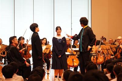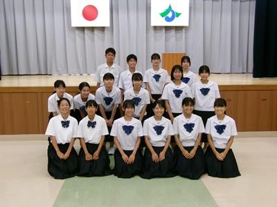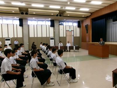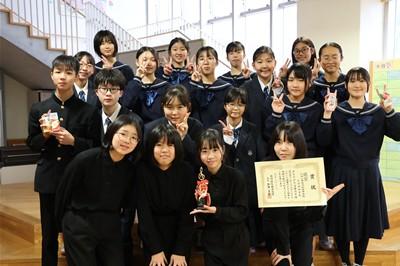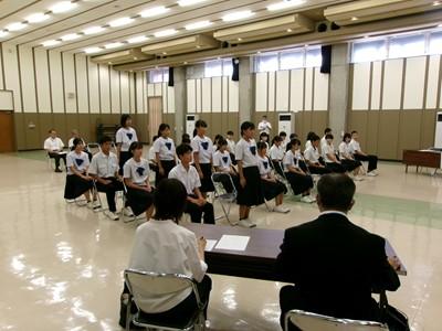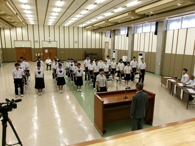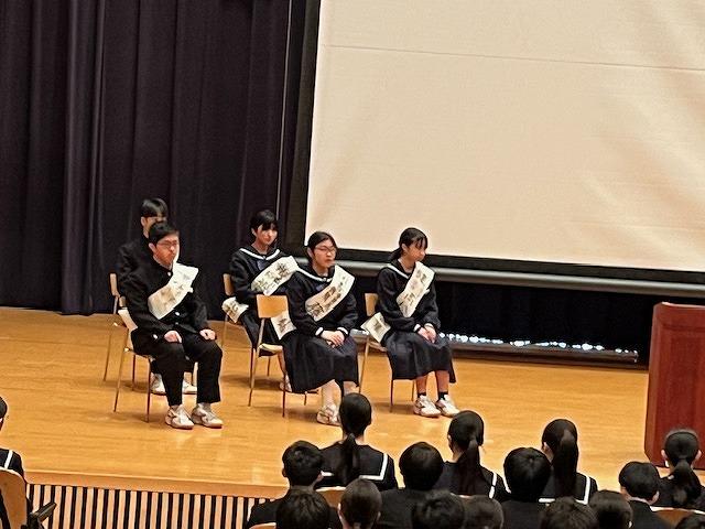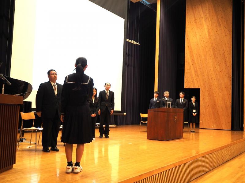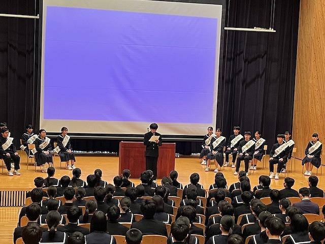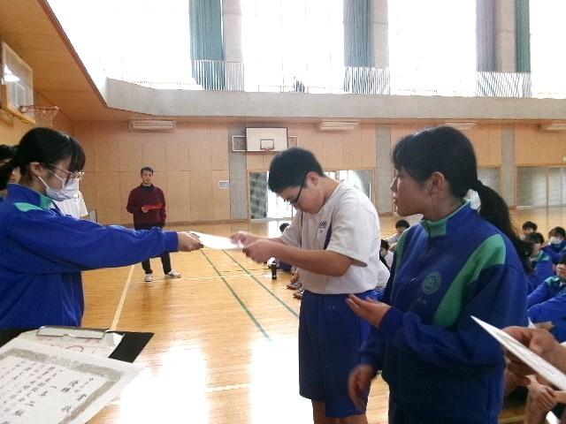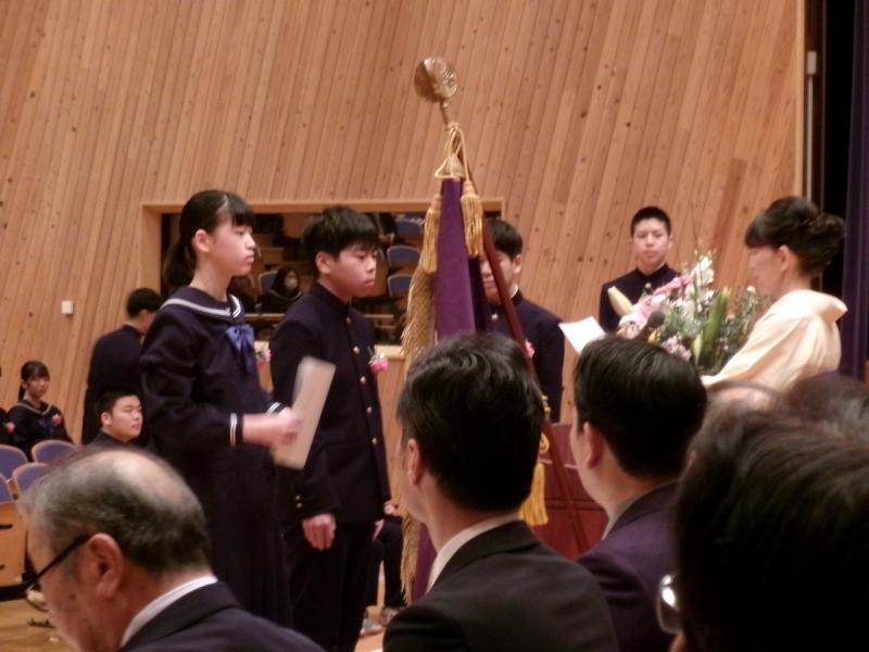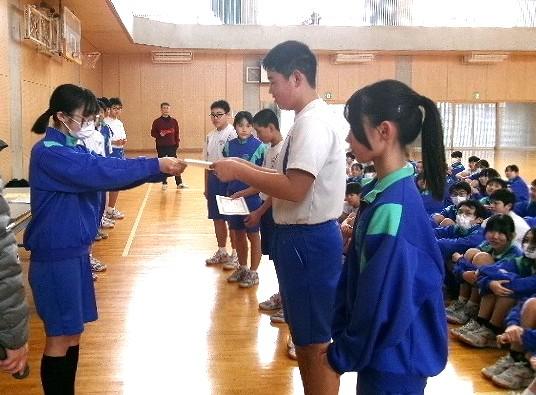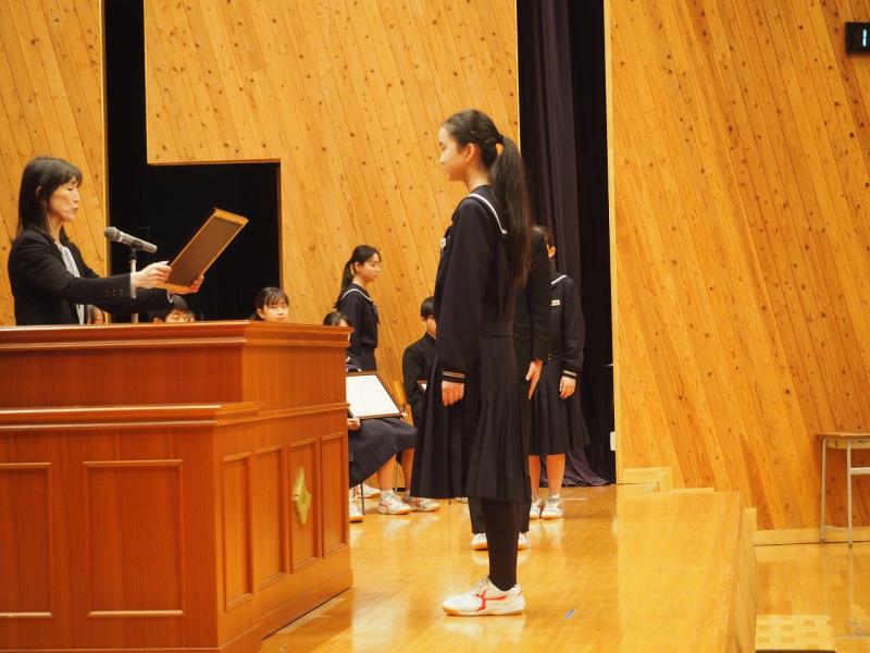 予行練習後に清水賞表彰式が行われ、受賞した3年納口心和さん、山本将吾さん、山本茉子さんにかほく市教育員会の諸井教育委員より記念品が授与されました。その後、本校の後期さわやか賞の表彰式も行われ、地道に頑張っている生徒、すばらしい行動を行っている生徒22名に校長先生より賞状が授与されました。