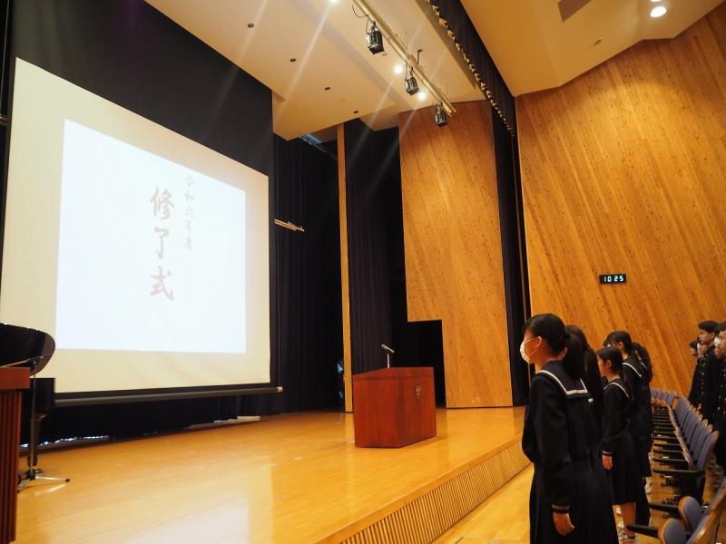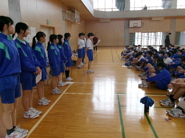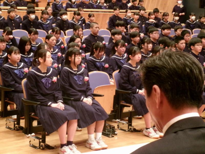 3限目には修了式を行い、校長先生からは、学習や部活動に取り組む姿勢が変わったこと、堂々と自分の考えを話せる生徒が増えたこと、そして、多くの頑張りをたくさん発信してくれたことなど、この1年間で成長したことや頑張ったことについてのお話がありました。また、新しい学年に向けて、一人一人が気持ちや行動を高めていってほしいと激励の言葉もいただきました。