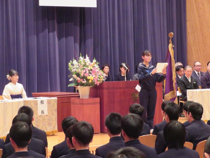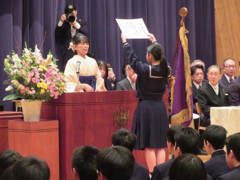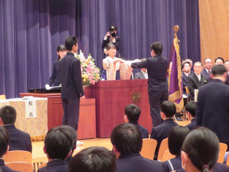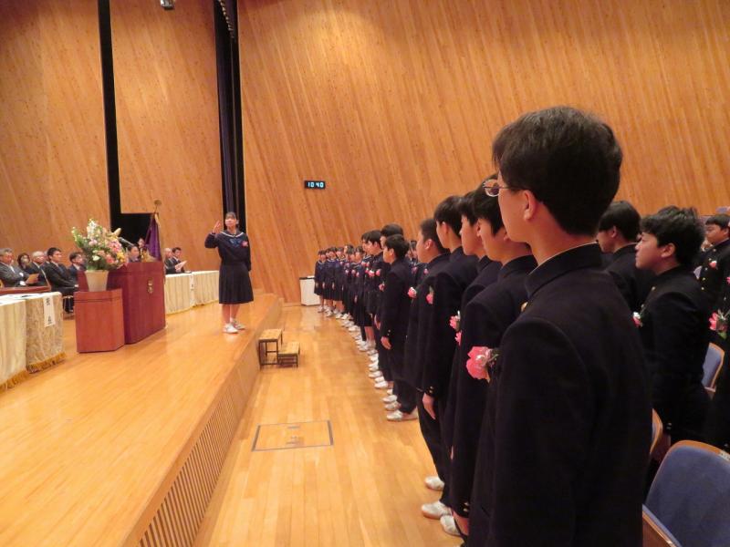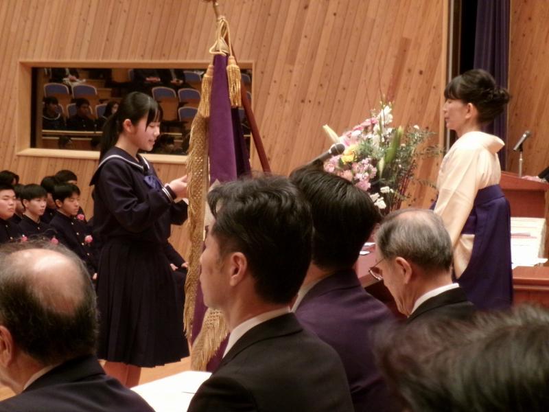 3月14日(金)第68回卒業証書授与式を挙行しました。卒業生104名が中学校課程を修了しました。校長先生の式辞では、「心の回復力を高める」というお話があり、自分らしく、しなやかに前へ進んでほしいということが話されました。在校生を代表して和田さんが送辞を述べ、卒業生を代表して山本さんが答辞を述べました。卒業の歌「群青」は、大変感動的な歌声で、式に参加された方の涙を誘いました。