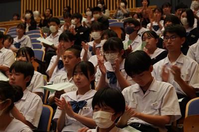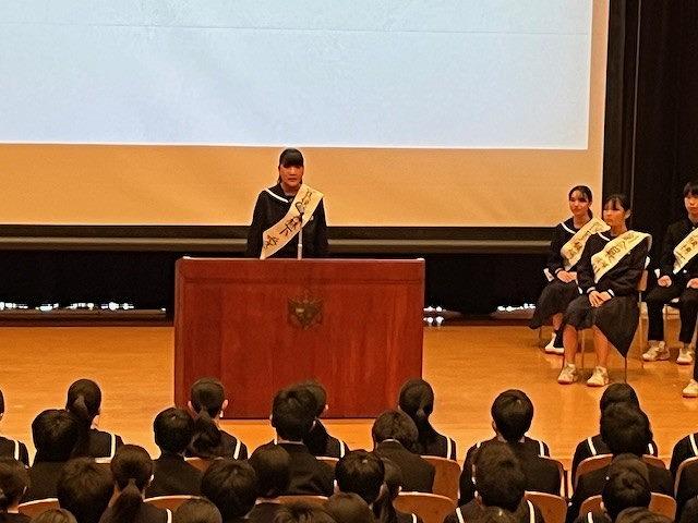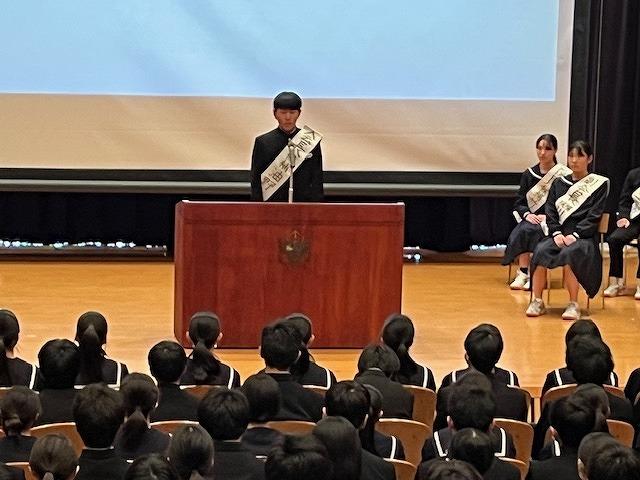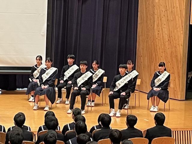 次年度前期生徒会役員の立候補者による立会演説会と選挙が行われました。立候補者は全校生徒に向けて、生徒全員が楽しいと思える学校を作りたい、笑顔の絶えない学校にしたいと訴え、河北台中のために何ができるか、どのようなことを取り組みたいかなど、熱い思いを真剣に語りかけていました。河北台中のリーダーとして、ぜひ頑張ってほしいと思います。
