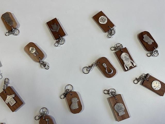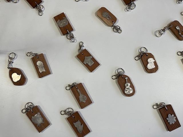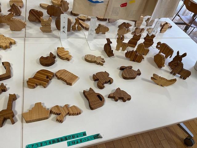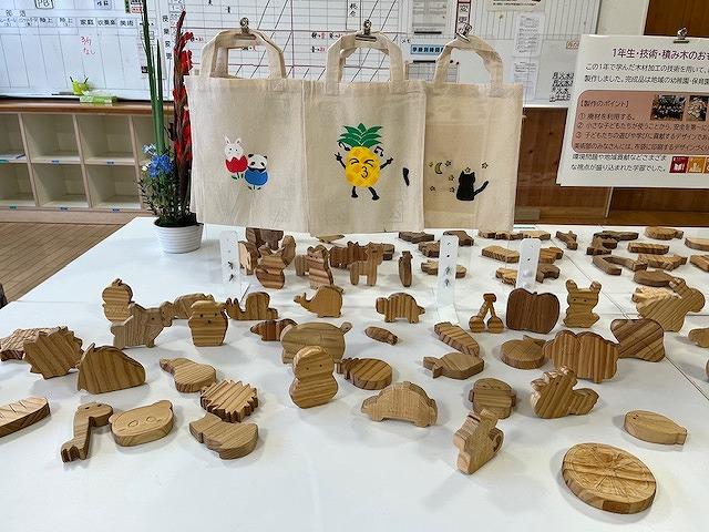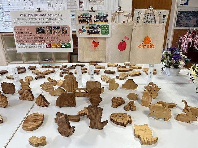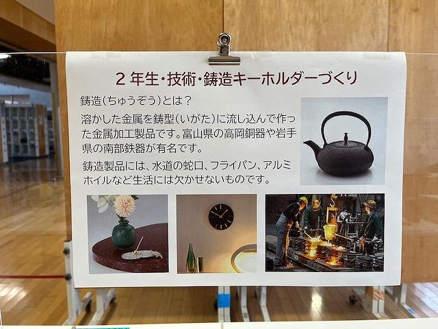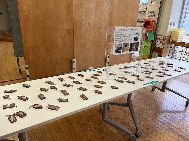 1、2年生が技術の時間に作った、鋳造キーホルダーや積み木のおもちゃが生徒ホールに展示されています。生徒一人一人のアイディアあふれる作品ばかりです。