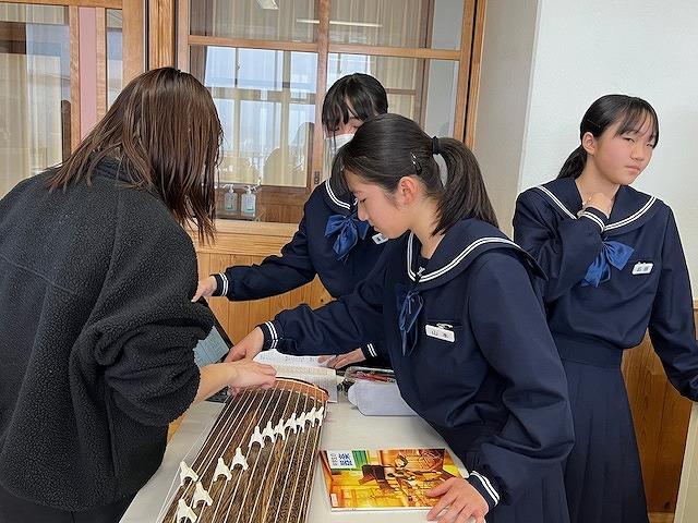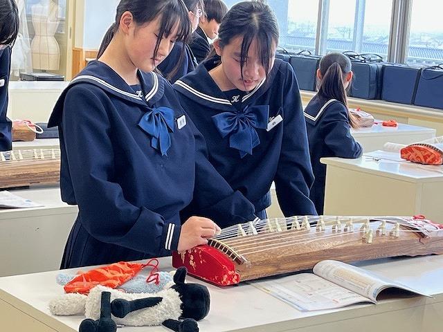 1年生の音楽では、「箏」の授業を行いました。基本的な奏法を学び、親しみのある日本の曲「さくらさくら」に取り組みました。2人ペアになり、箏演奏を練習し、最後に発表会をすることができました。箏の美しい音がよく響いていました。